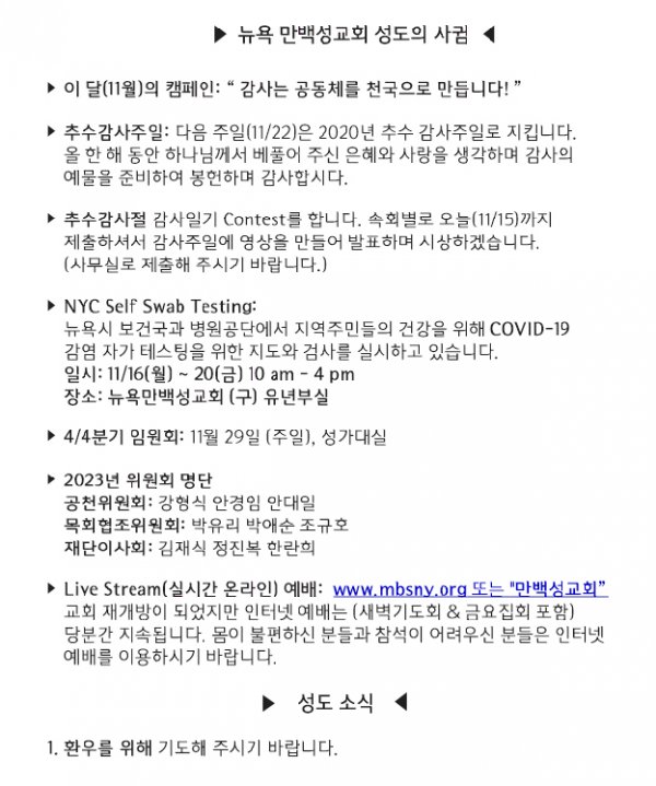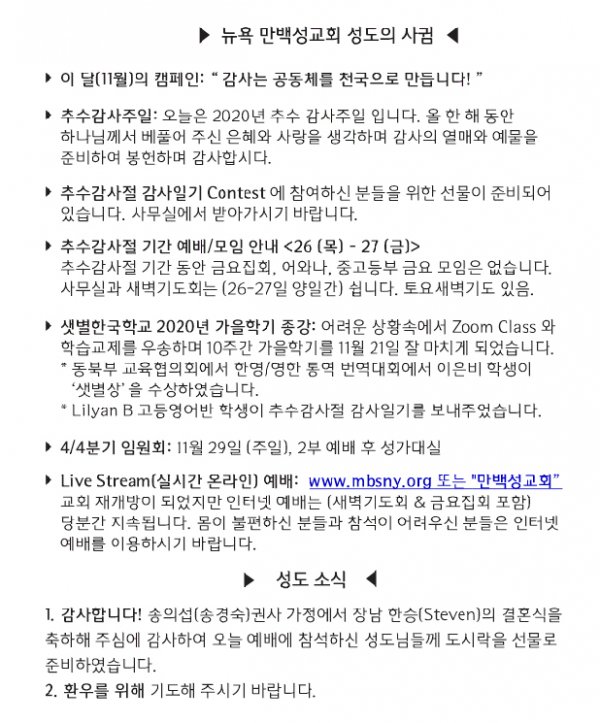 [교회소식] 2020년 11월 22일 뉴욕만백성교회 성도의 사귐