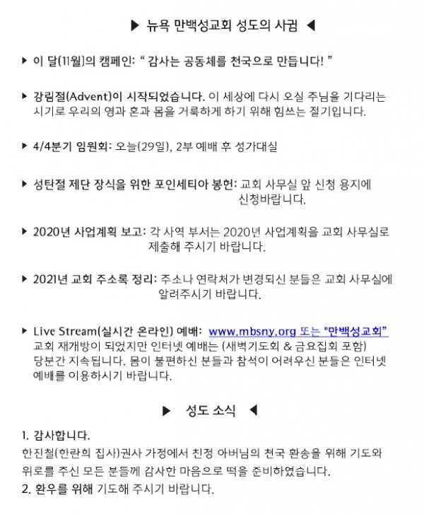 [교회소식] 2020년 11월 29일 뉴욕만백성교회 성도의 사귐