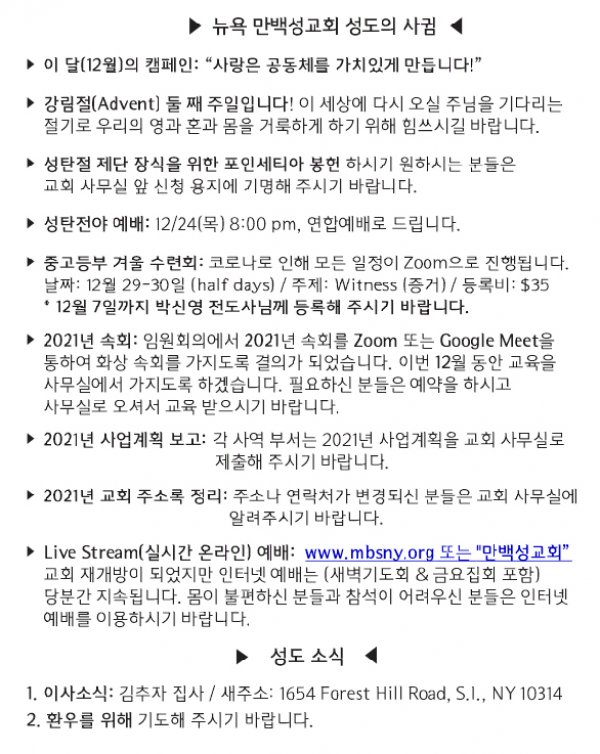 [교회소식] 2020년 12월 6일 뉴욕만백성교회 성도의 사귐