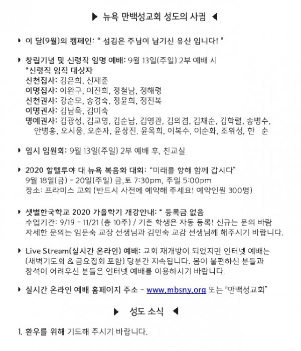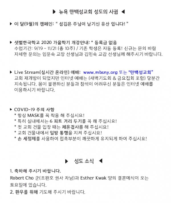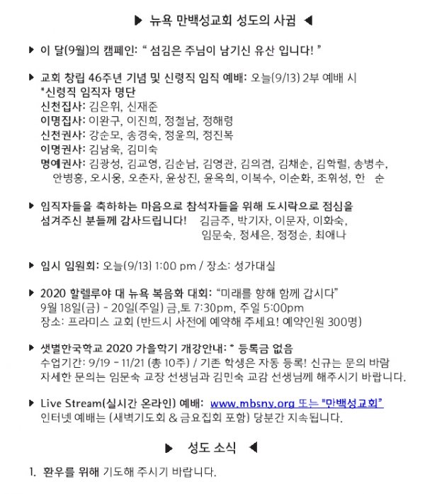 [교회소식] 2020년 9월 13일 뉴욕만백성교회 성도의 사귐