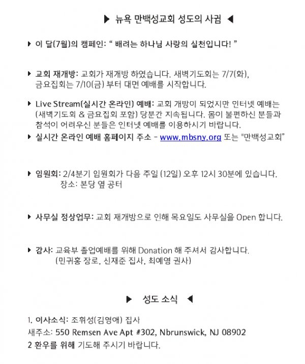 [교회소식] 2020년 7월 5일 뉴욕만백성교회 성도의 사귐