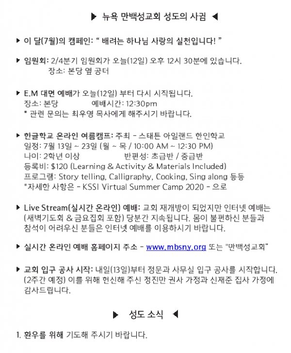[교회소식] 2020년 7월 12일 뉴욕만백성교회 성도의 사귐