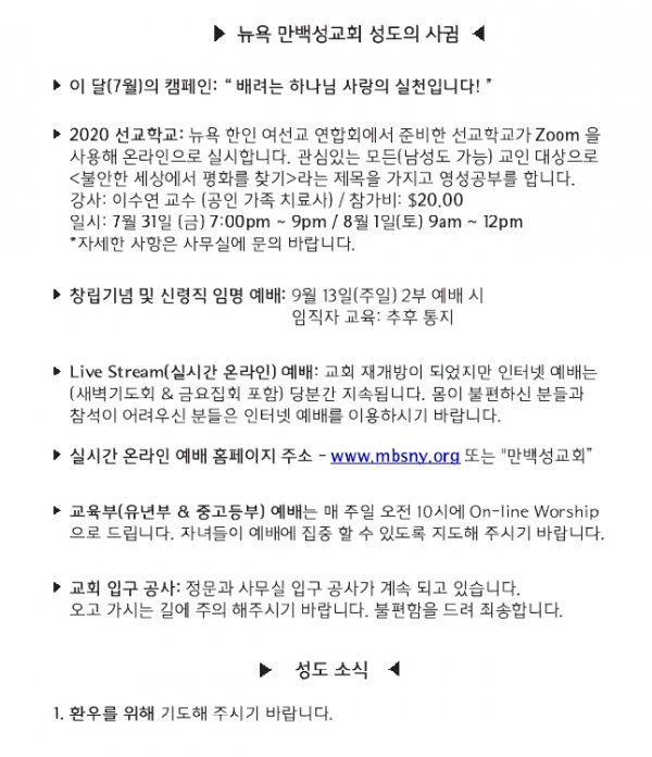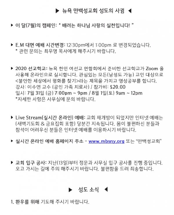 [교회소식] 2020년 7월 26일 뉴욕만백성교회 성도의 사귐