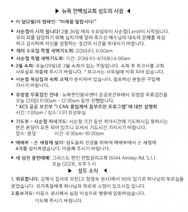 [교회소식] 2020년 2월 23일 뉴욕만백성교회 성도의 사귐