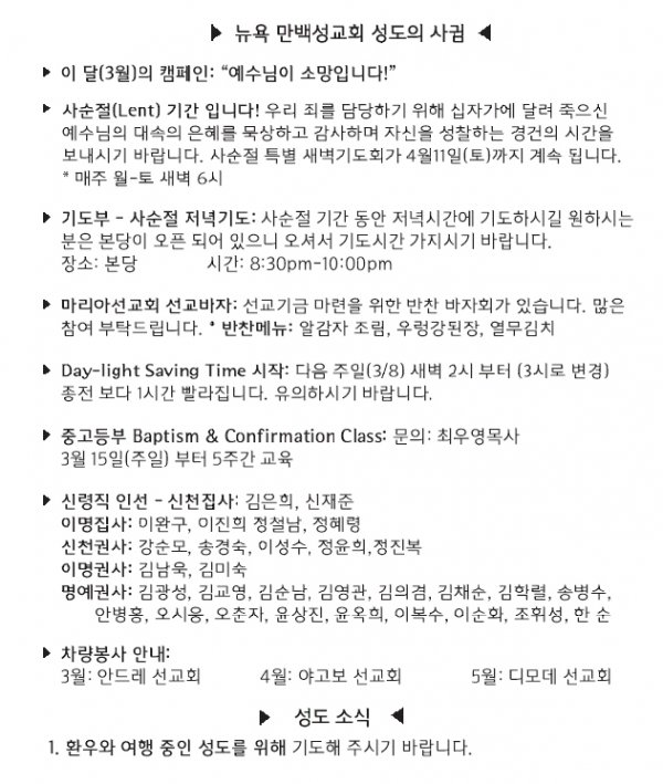 [교회소식] 2020년 3월 1일 뉴욕만백성교회 성도의 사귐