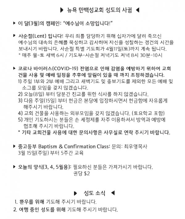 [교회소식] 2020년 3월 8일 뉴욕만백성교회 성도의 사귐