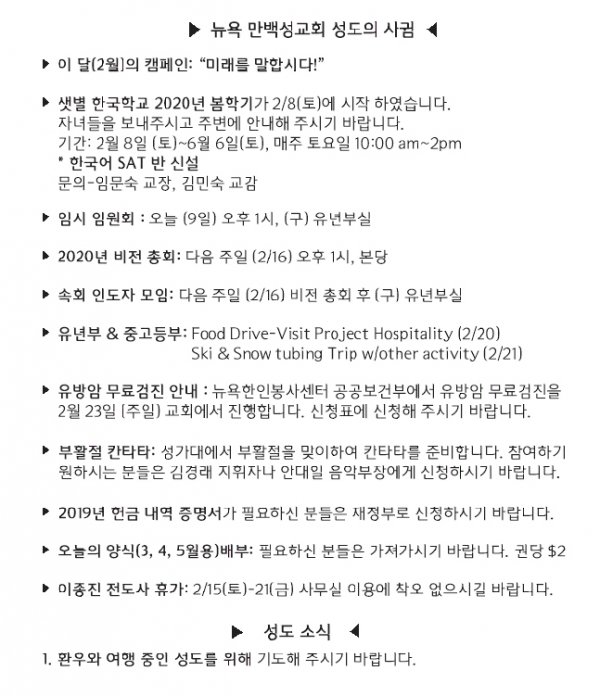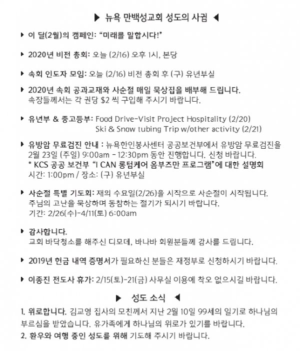 [교회소식] 2020년 2월 9일 뉴욕만백성교회 성도의 사귐