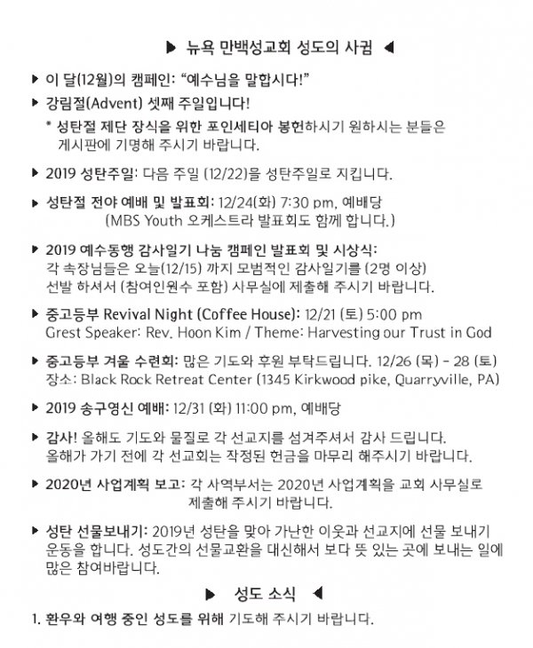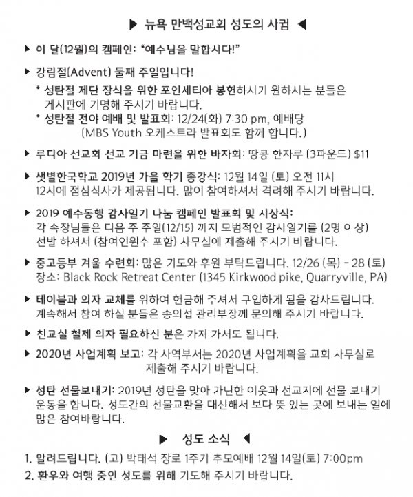 [교회소식] 2019년 12월 15일 뉴욕만백성교회 성도의 사귐