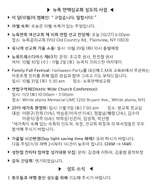 [교회소식] 2019년 10월 27일 뉴욕만백성교회 성도의 사귐
