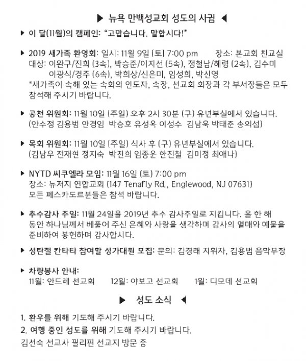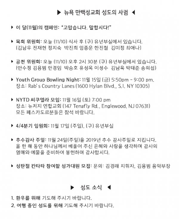 [교회소식] 2019년 11월 10일 뉴욕만백성교회 성도의 사귐