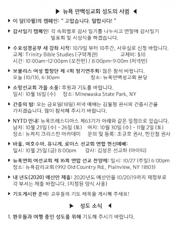 [교회소식] 2019년 10월 13일 뉴욕만백성교회 성도의 사귐