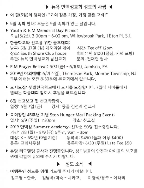 [교회소식] 2019년 5월 26일 뉴욕만백성교회 성도의 사귐