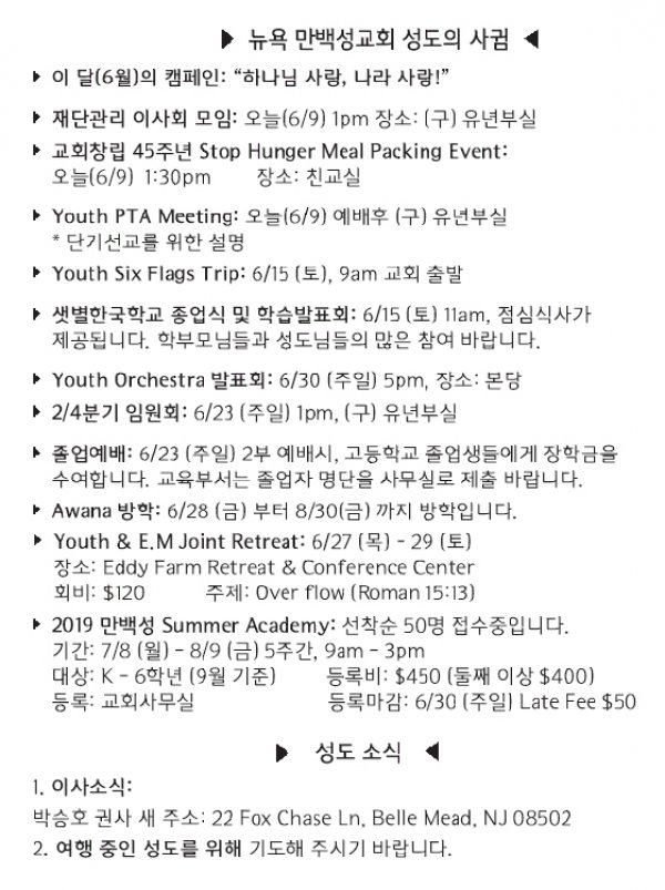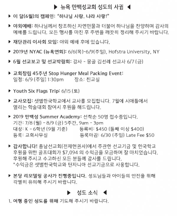 [교회소식] 2019년 6월 2일 뉴욕만백성교회 성도의 사귐