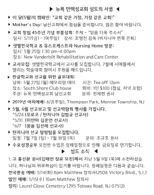 [교회소식] 2019년 5월 12일 뉴욕만백성교회 성도의 사귐