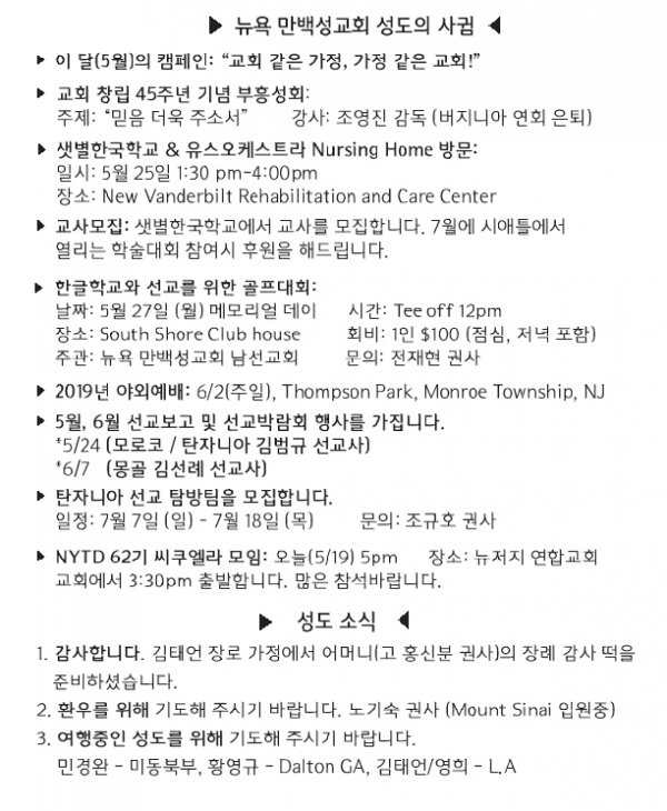 [교회소식] 2019년 5월 19일 뉴욕만백성교회 성도의 사귐