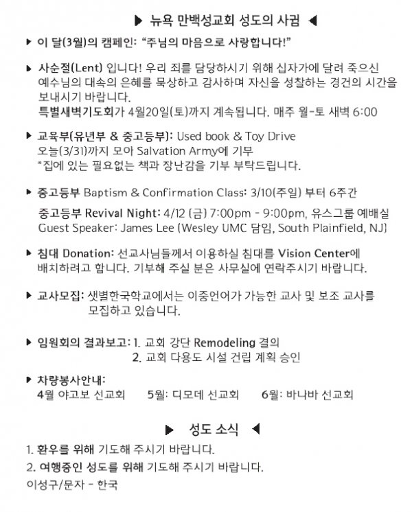 [교회소식] 2019년 3월 31일 뉴욕만백성교회 성도의 사귐