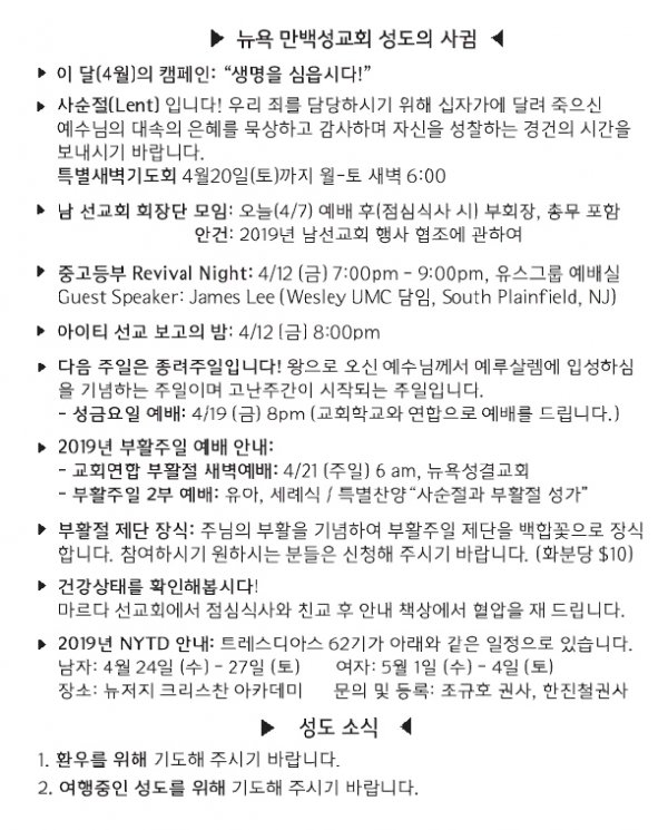[교회소식] 2019년 4월 7일 뉴욕만백성교회 성도의 사귐