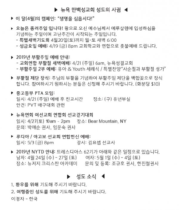 [교회소식] 2019년 4월 14일 뉴욕만백성교회 성도의 사귐