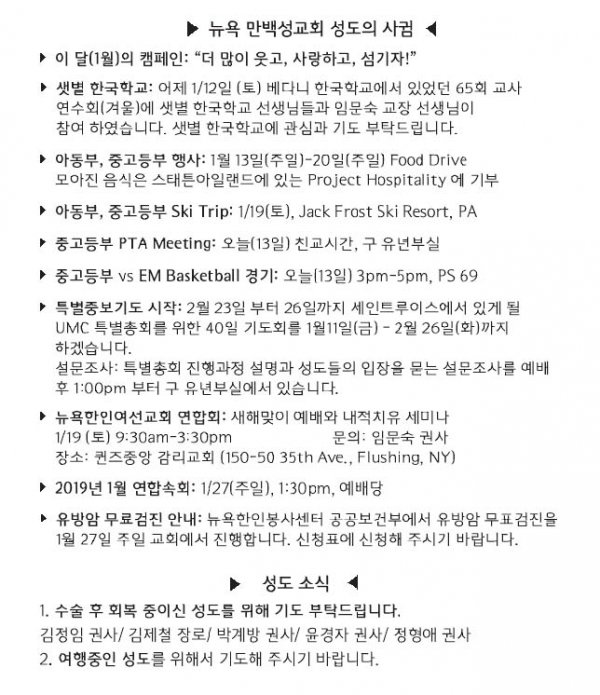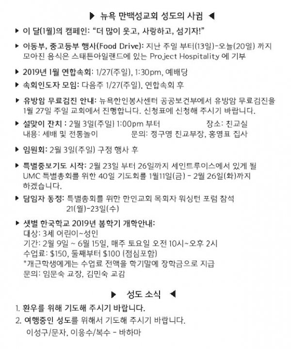 [교회소식] 2019년 1월 13일 뉴욕 만백성교회 성도의 사귐