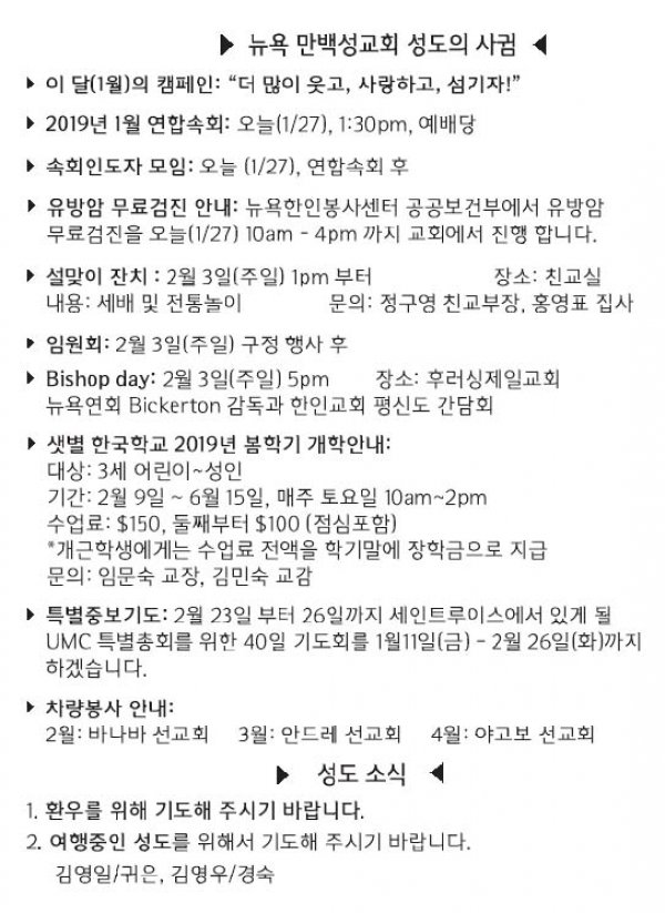 [교회소식] 2019년 1월 27일 뉴욕만백성교회 성도의 사귐