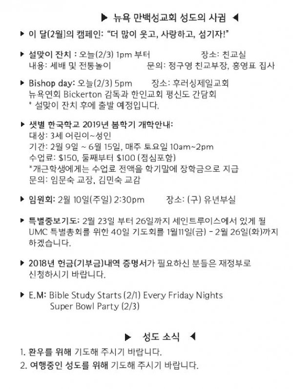 [교회소식] 2019년 2월 3일 뉴욕만백성교회 성도의 사귐