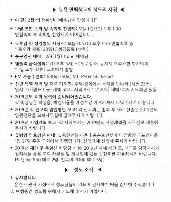 [교회소식] 2018년 12월 30일 뉴욕 만백성교회 성도의 사귐