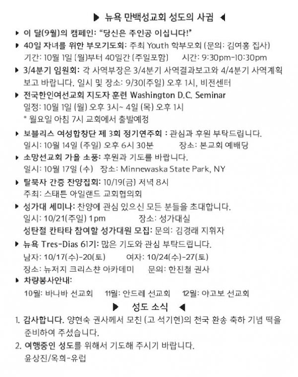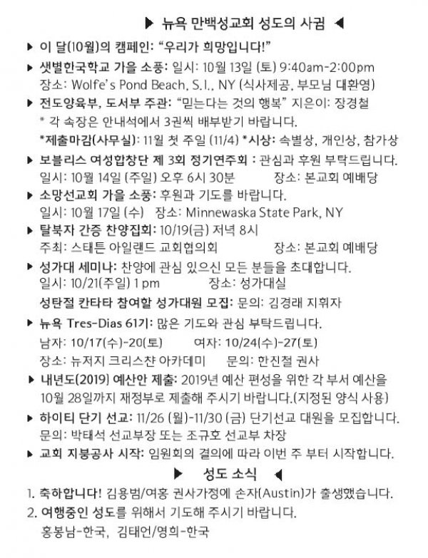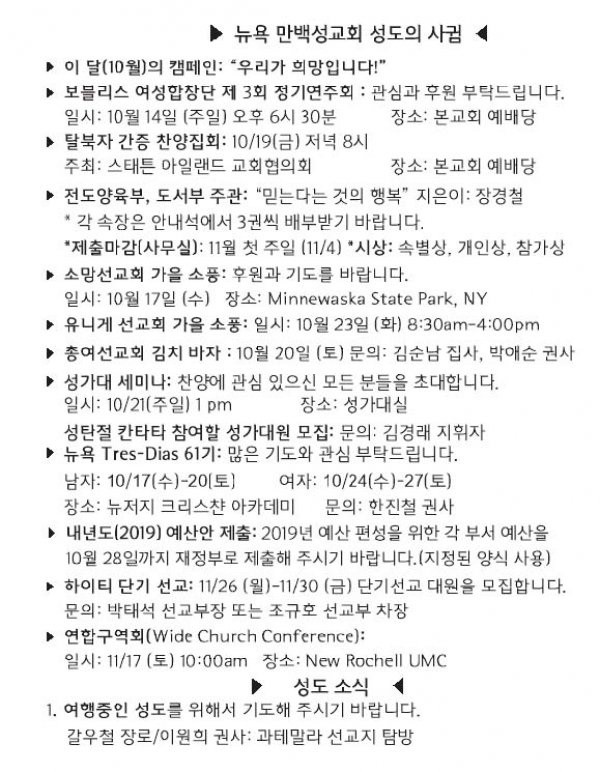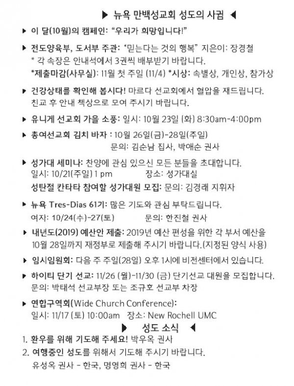 [교회소식] 2018년 10월 07일 뉴욕 만백성교회 성도의 사귐
