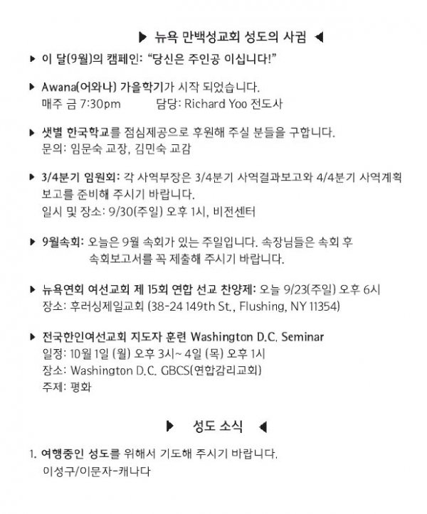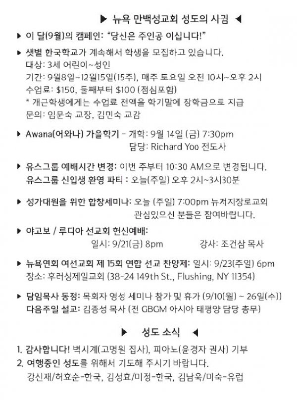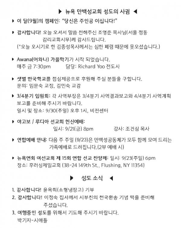 [교회소식] 2018년 9월 23일 뉴욕 만백성교회 성도의 사귐