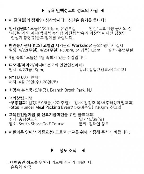 [교회소식] 2018년 4월 22일 만백성 성도의 사귐