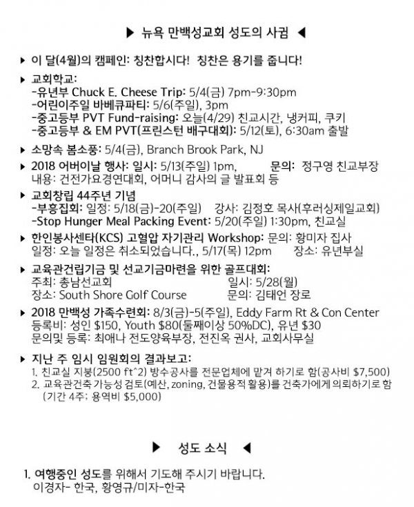[교회소식] 2018년 4월 29일 만백성 성도의 사귐