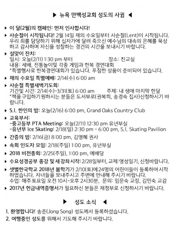 날짜: 2018.02.11 글쓴이 : 관리자 | 교회 소식