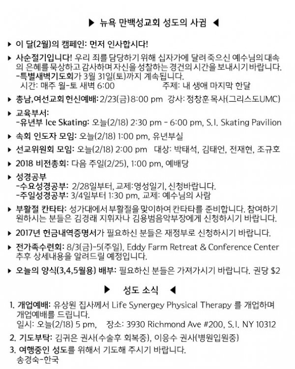 [교회소식] 2018년 2월 11일 만백성 성도의 사귐