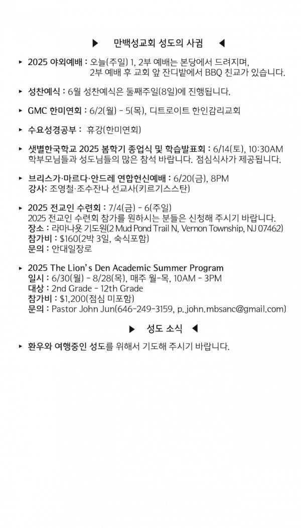 [교회소식] 2025년 6월 1일 뉴욕 만백성교회 성도의 사귐