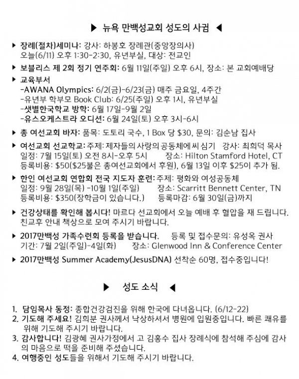 날짜: 2017.06.11 글쓴이 : 관리자 | 교회 소식