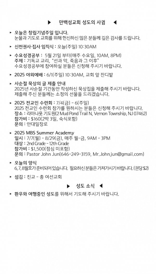 [교회소식] 2025년 5월 18일 뉴욕 만백성교회 성도의 사귐
