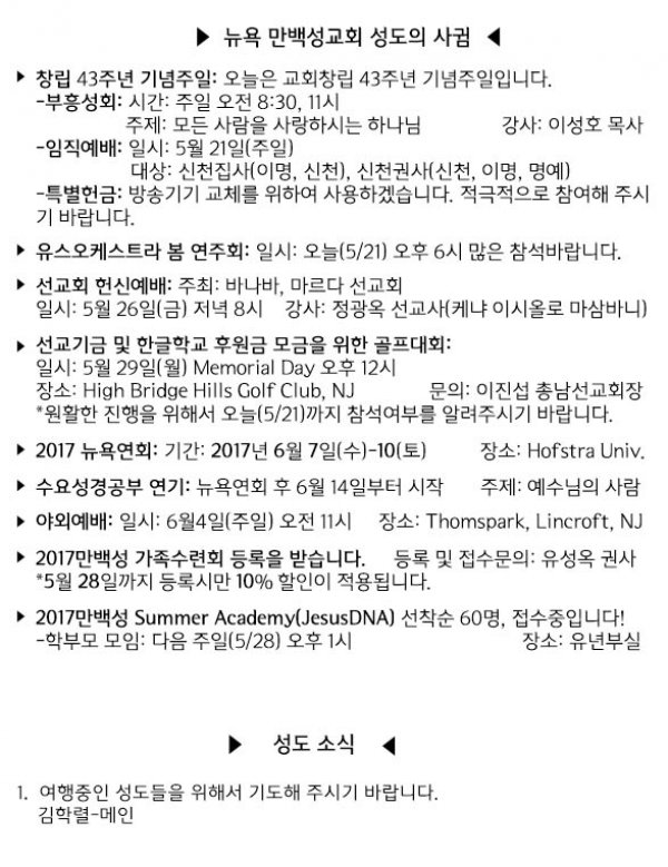 [교회소식] 5월 21일 만백성 성도의 사귐