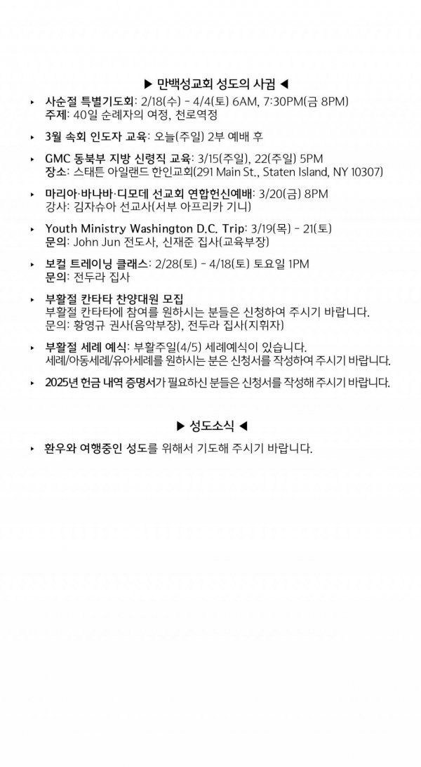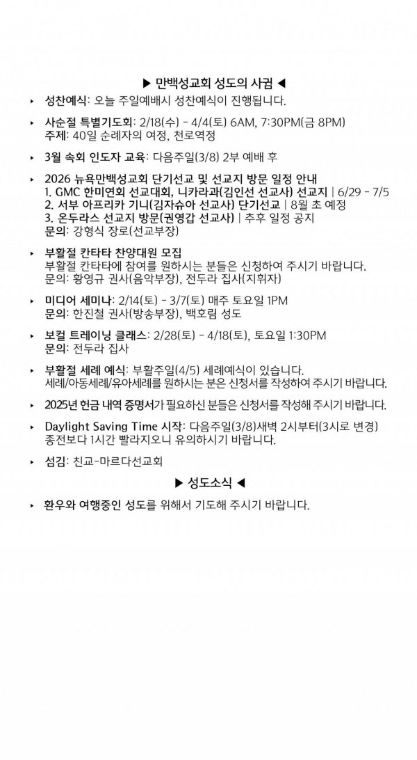 [교회소식] 2026년 3월 1일 뉴욕 만백성교회 성도의 사귐