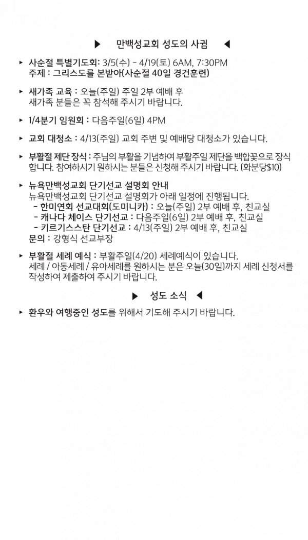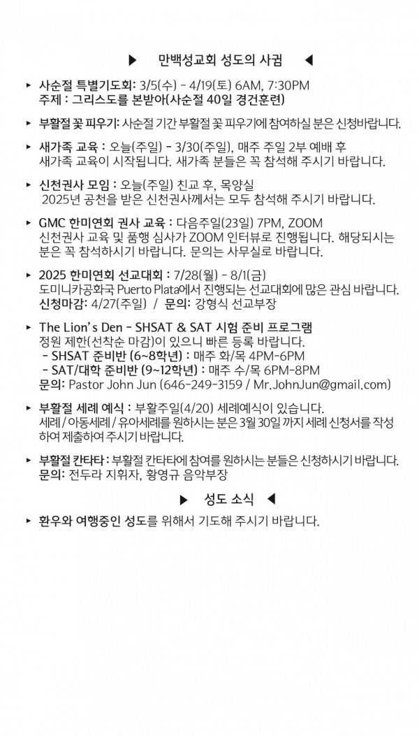 [교회소식] 2025년 3월 16일 뉴욕 만백성교회 성도의 사귐