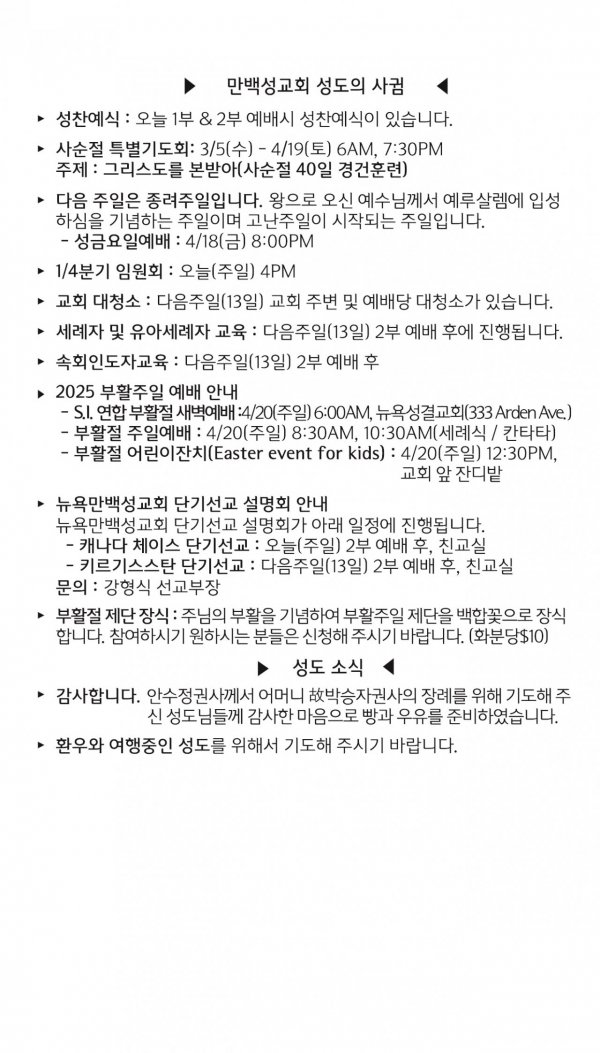 [교회소식] 2025년 3월 30일 뉴욕 만백성교회 성도의 사귐