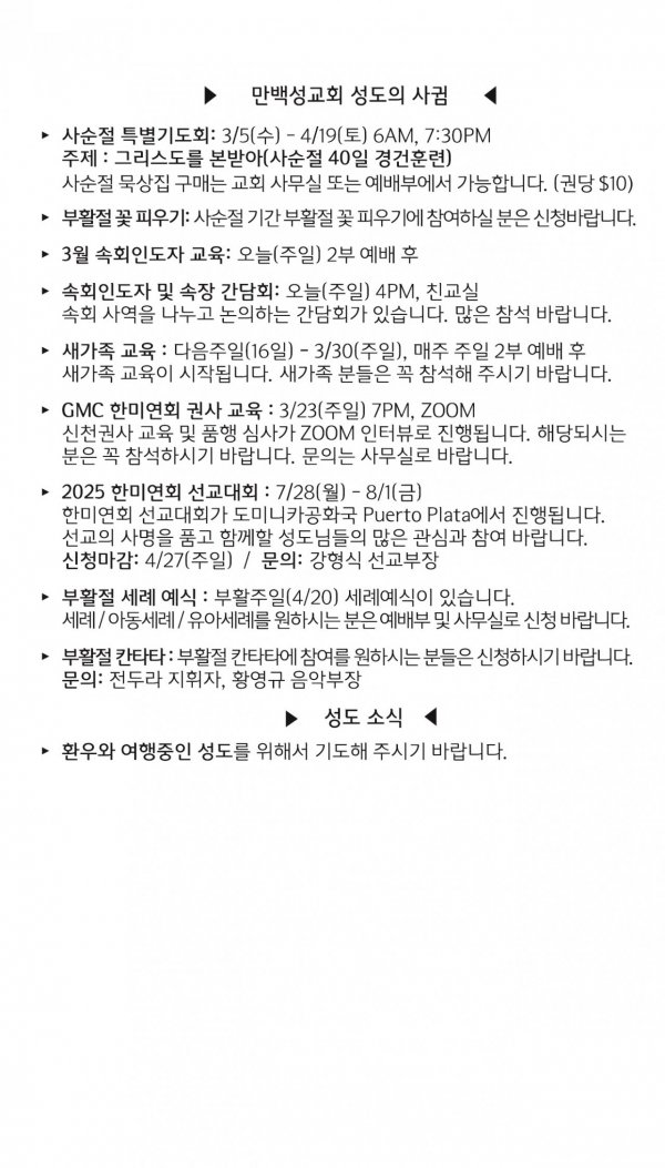 [교회소식] 2025년 3월 9일 뉴욕 만백성교회 성도의 사귐