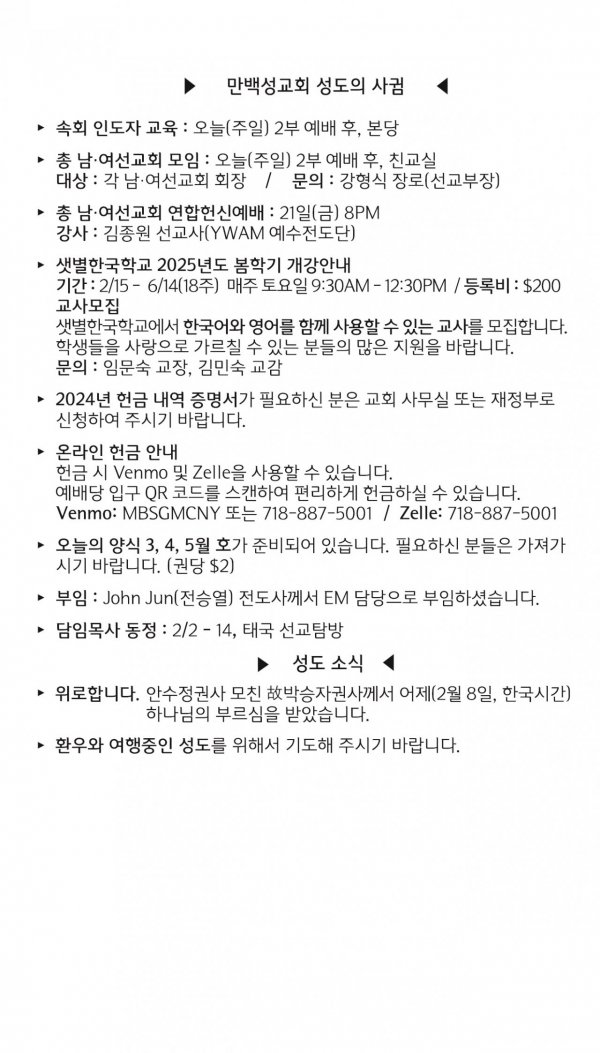 [교회소식] 2025년 2월 9일 뉴욕 만백성교회 성도의 사귐