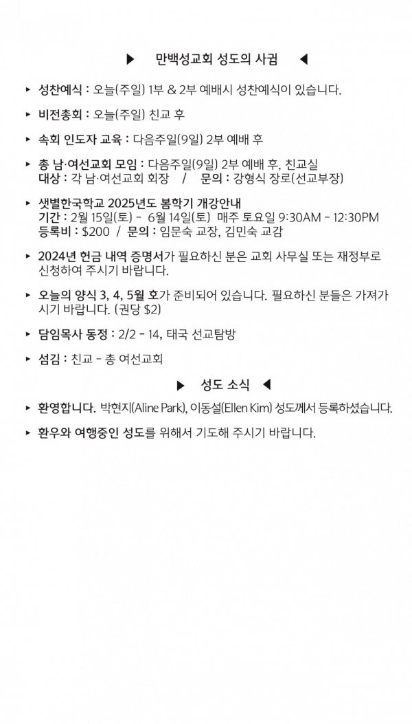 [교회소식] 2025년 2월 2일 뉴욕 만백성교회 성도의 사귐