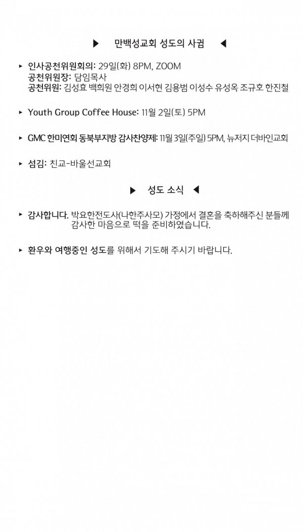 [교회소식] 2024년 10월 20일 뉴욕 만백성교회 성도의 사귐