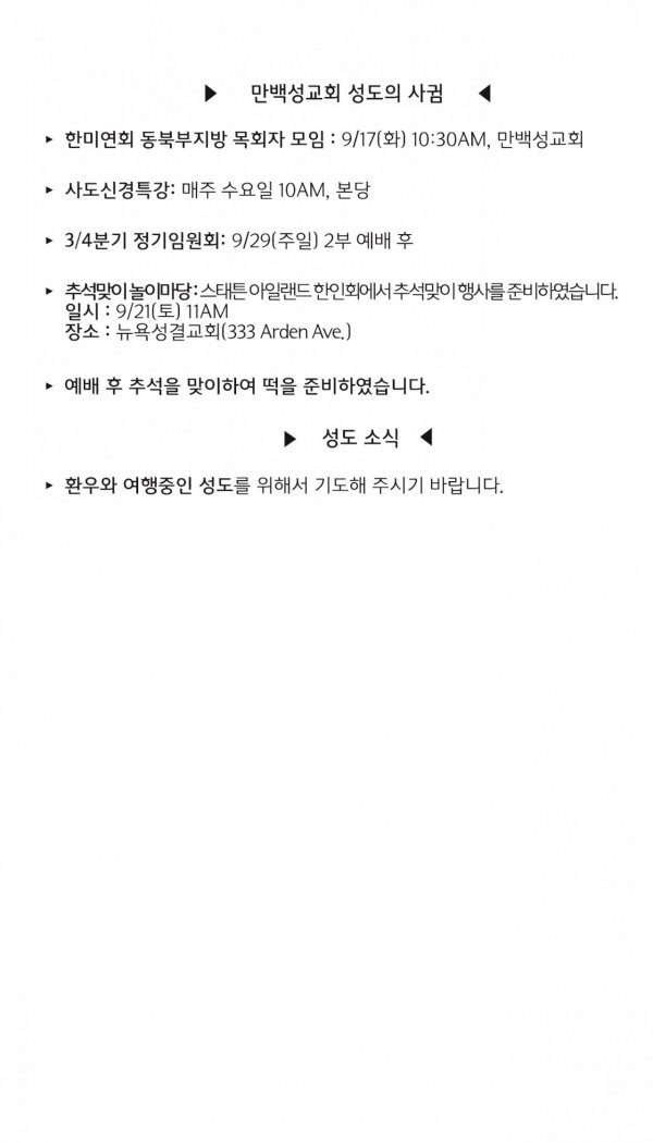 [교회소식] 2024년 9월 15일 뉴욕 만백성교회 성도의 사귐