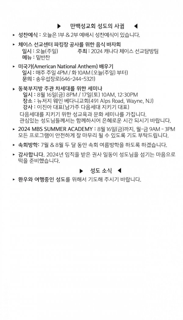 [교회소식] 2024년 8월 4일 뉴욕 만백성교회 성도의 사귐