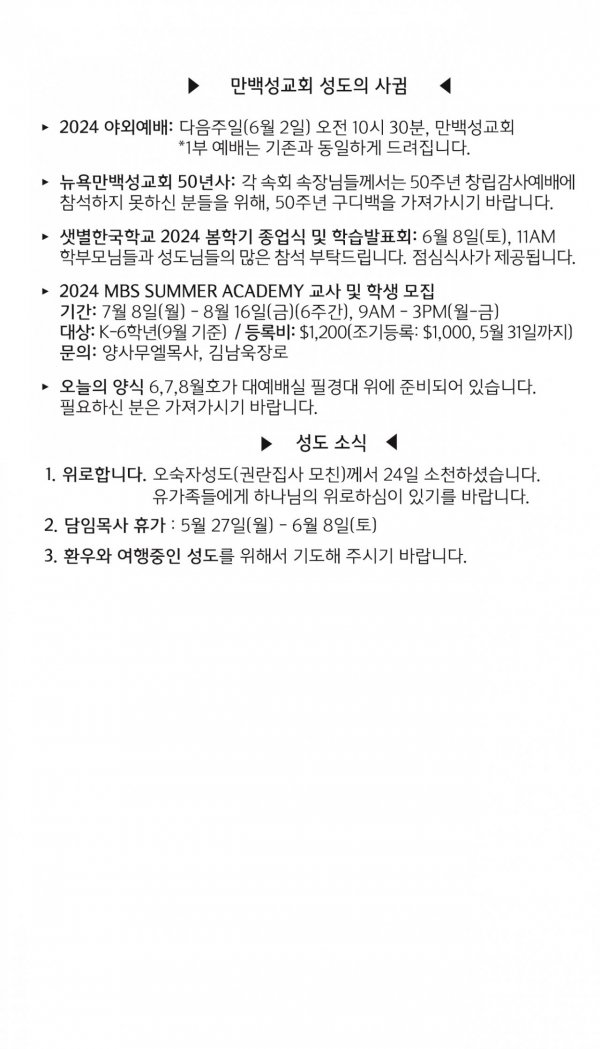 [교회소식] 2024년 5월 26일 뉴욕 만백성교회 성도의 사귐