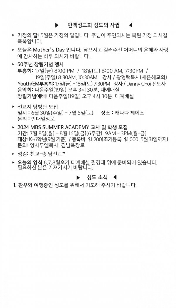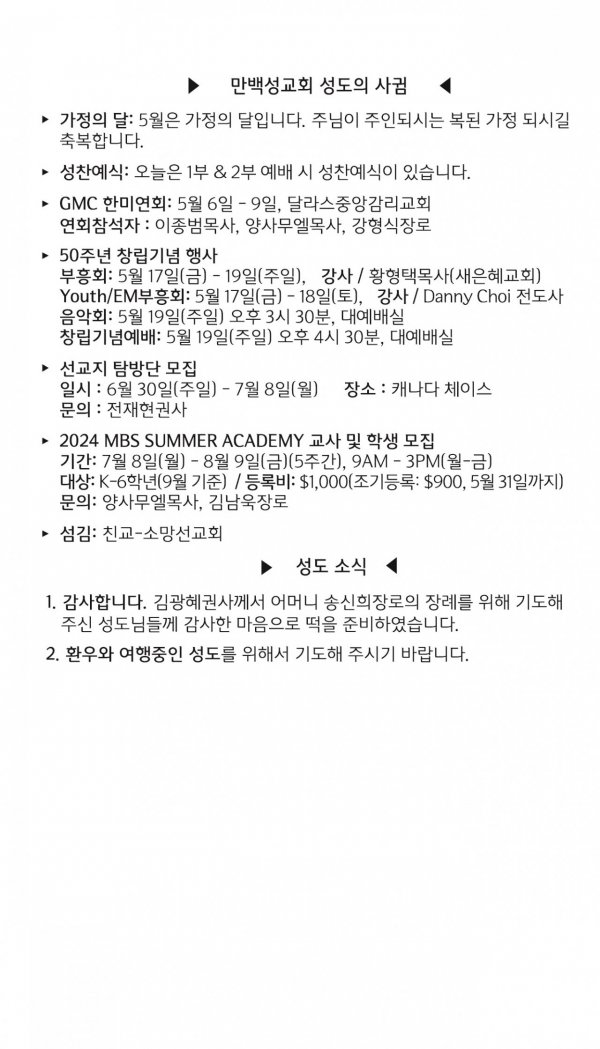 [교회소식] 2024년 5월 12일 뉴욕 만백성교회 성도의 사귐