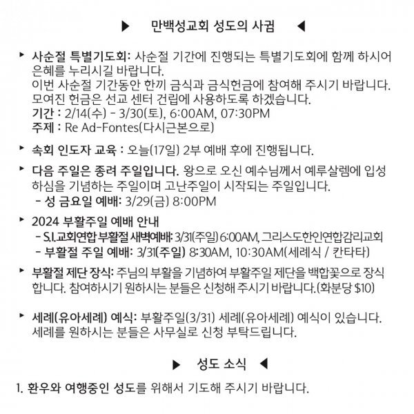 [교회소식] 2024년 3월 17일 뉴욕 만백성교회 성도의 사귐