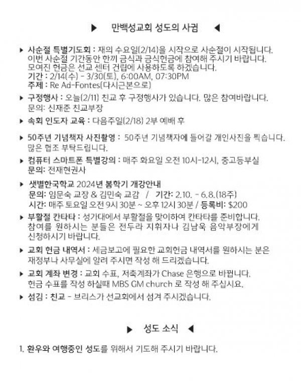 날짜: 2024.02.11 글쓴이 : 관리자 | 교회 소식