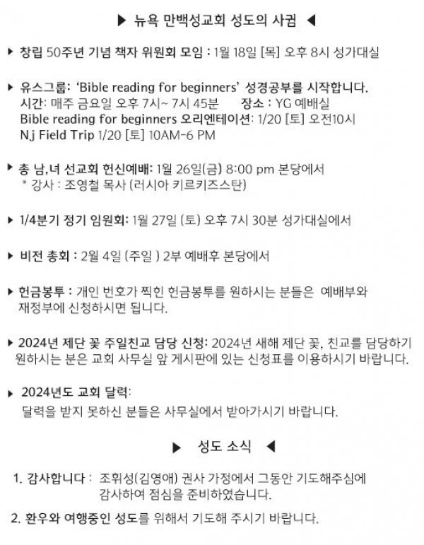 [교회소식] 2024년 1월 14일 뉴욕 만백성교회 성도의 사귐